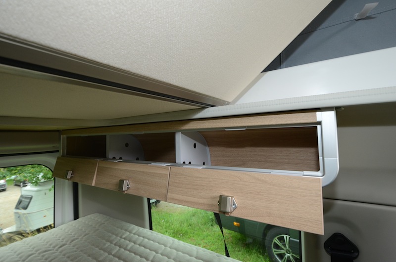 Dans cette catégorie LIFE, avantage au CapeTown (ci-dessous) sur VWT5, seul modèle à se glisser sous la barre des 2 m de haut. Des particularités, ce CapeTown n’en manque pas. Il possède, comme le Sydney (4,96m), un toit relevable de série avec un couchage haut. Cette disposition reste possible sur les autres modèles HYMERCAR, mais à condition de passer par la case des options à un prix assez avantageux (3 500 €) comparé à la concurrence.
