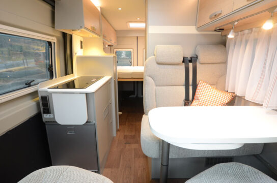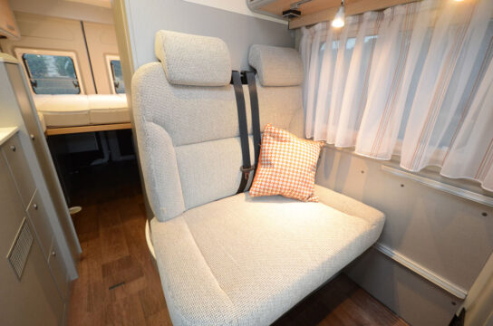 Comme le reste de la gamme, cette nouvelle référence profite d’une ambiance très flatteuse. La finition de mobilier « Grand Oak » aux tons clairs est associée à des teintes argent et blanc mat pour un ensemble lumineux et très actuel. Un soin tout particulier a également été apporté au traitement de l’éclairage, avec des spots intégrés dans le pavillon et des lumières d’ambiance en dînette et en cuisine.