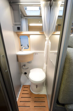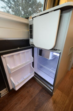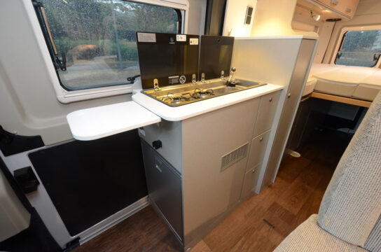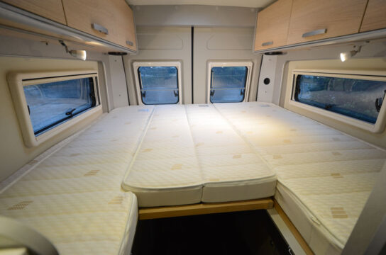 Comme l’ensemble des fourgons Hymercar sur Fiat, les Free peuvent être équipés d’un toit levable avec couchage 135 x 200 cm en option (environ 3.500 €). Une solution qui permet de profiter de deux places nuit supplémentaires sans entamer l’espace de vie à bord et ce, toute l’année grâce à une rallonge dérivée de chauffage (option). À moins de lui préférer un unique couchage additionnel en dînette.