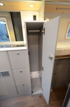 En reprenant le cabinet de toilette et le bloc-cuisine du 540 à l’identique, Hymercar parvient cependant à préserver des longueurs de matelas de 182 cm côté gauche et 192 cm côté droit. Mais il faudra, du coup, se contenter d’un frigo de 65 l. Pas avare en rangements, le 602 compte six placards de pavillon en chambre, de nombreux compartiments sous les lits ainsi qu’une penderie de 21 cm de large.