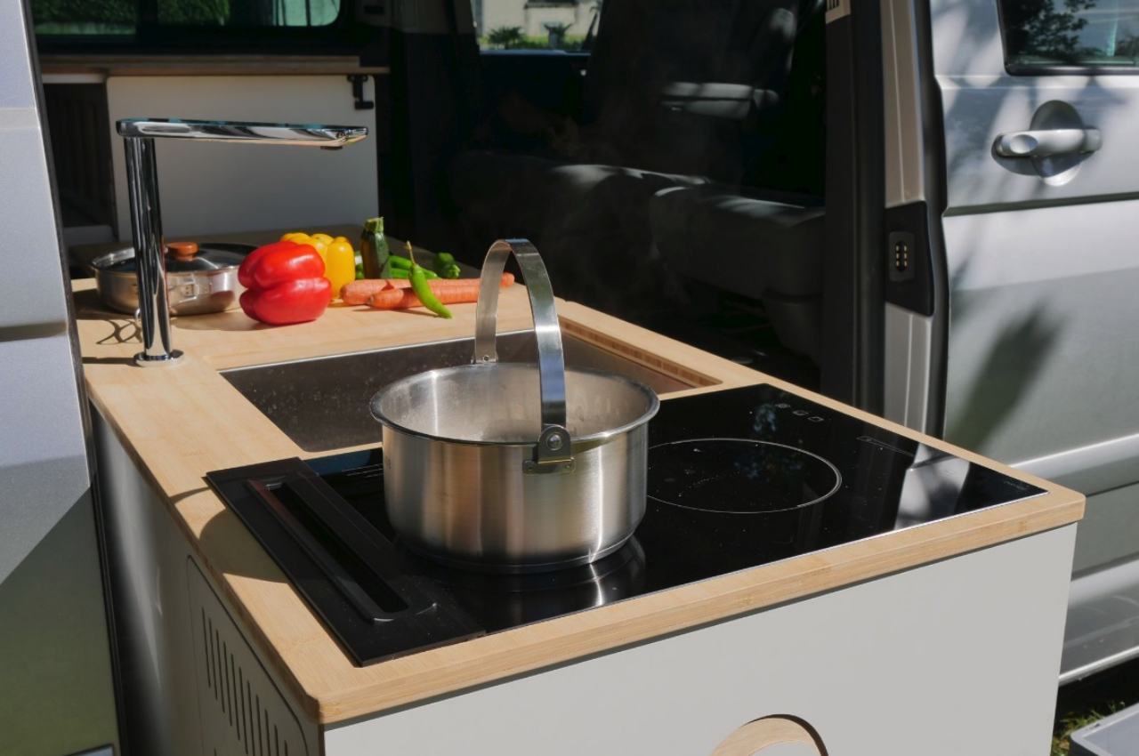Le bloc cuisine comprend une table de cuisson à deux brûleurs alimentés au gaz et un évier en acier inoxydable. Le réfrigérateur de 28 litres intègre pour sa part un meuble articulé situé sur le côté opposé, derrière le conducteur.