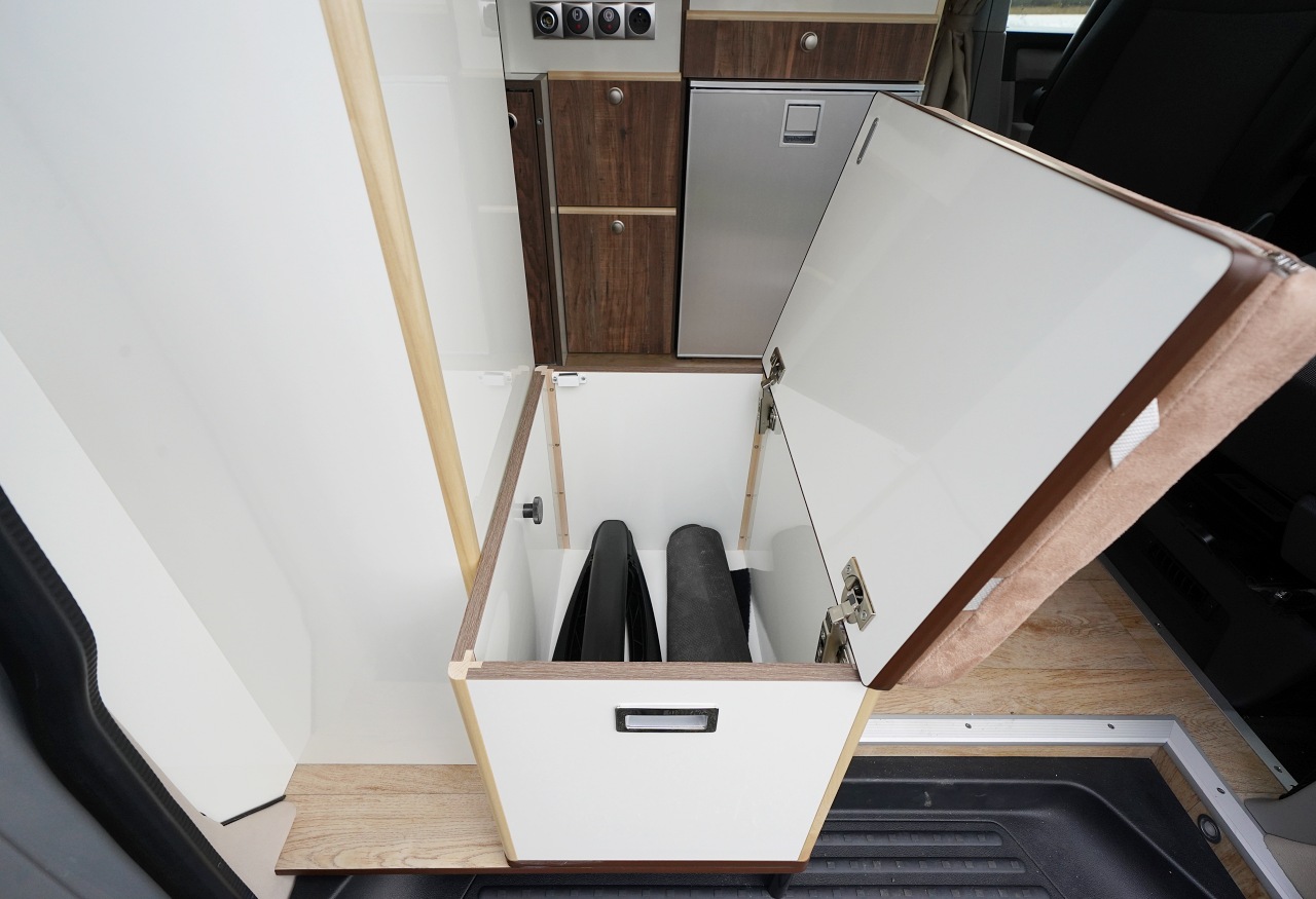 Le passage du VW ne se fait pas sans contrepartie. Sur ce fourgon, le galbe des parois influence directement la longueur du couchage, légèrement plus importante sur le Renault Trafic que sur le Transporter. Pas grand chose, une poignée de centimètres (4 cm), mais ce supplément d’espace aura peut-être son importance. Autre adaptation nécessaire, la présence de deux réservoirs des eaux usées (2 X 30 Litres), contre un seul sur le Renault.