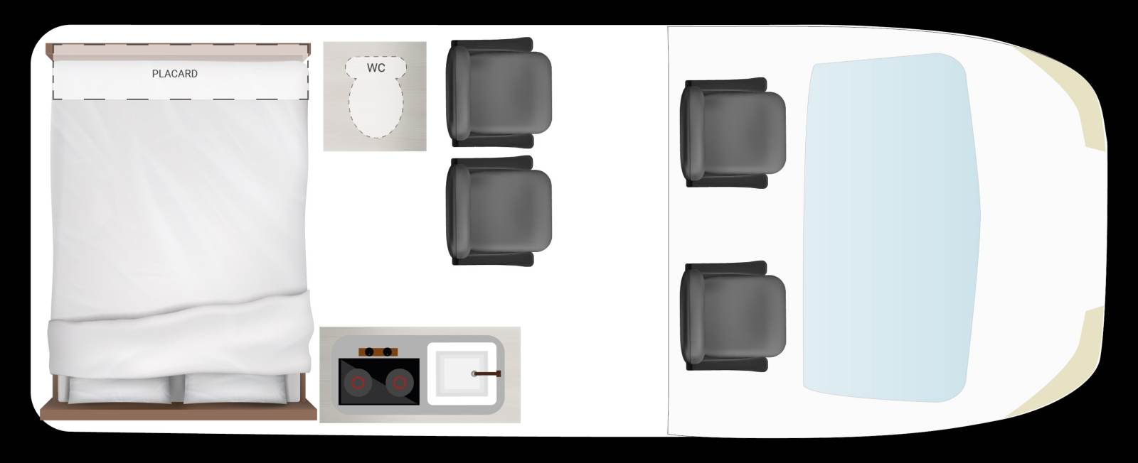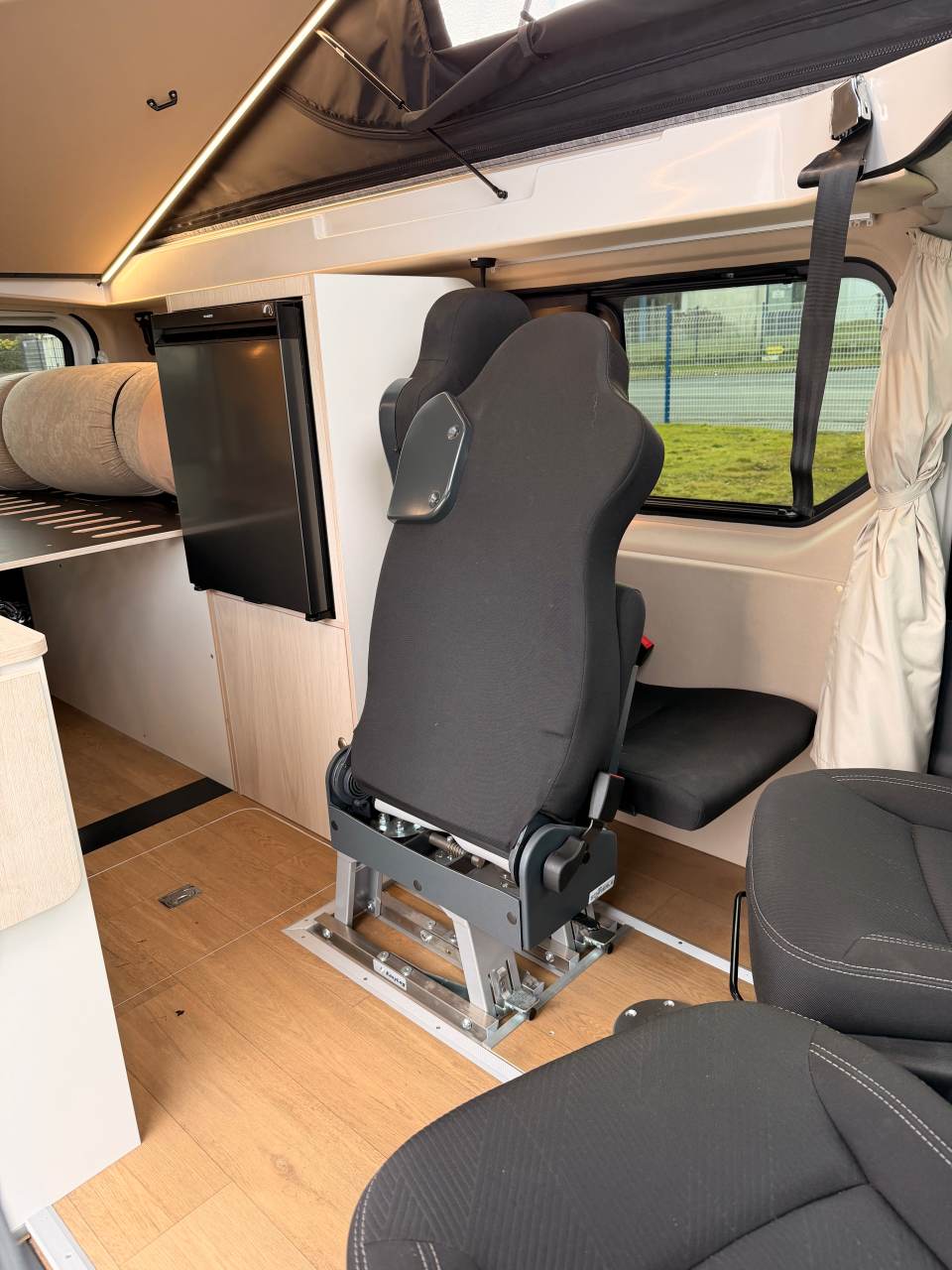 Selon le nombre de place route prévu au départ, deux ou quatre, le schéma d’aménagement change radicalement. Position de la cuisine et du réfrigérateur, rangement : les cartes sont totalement rebattues comme en attestent les plans (voir ci-dessous). Et si la meilleure solution se trouvait au milieu. Ni deux, ni quatre, mais trois. À partir de la version 2 places, JCG Créations propose d’ajouter un siège route supplémentaire qui viendra remplacer, si nécessaire, le petit coffre à l’entrée. Etant entendu que les sièges sont amovibles, vous pouvez aussi en retirer un sur la version 4 places.