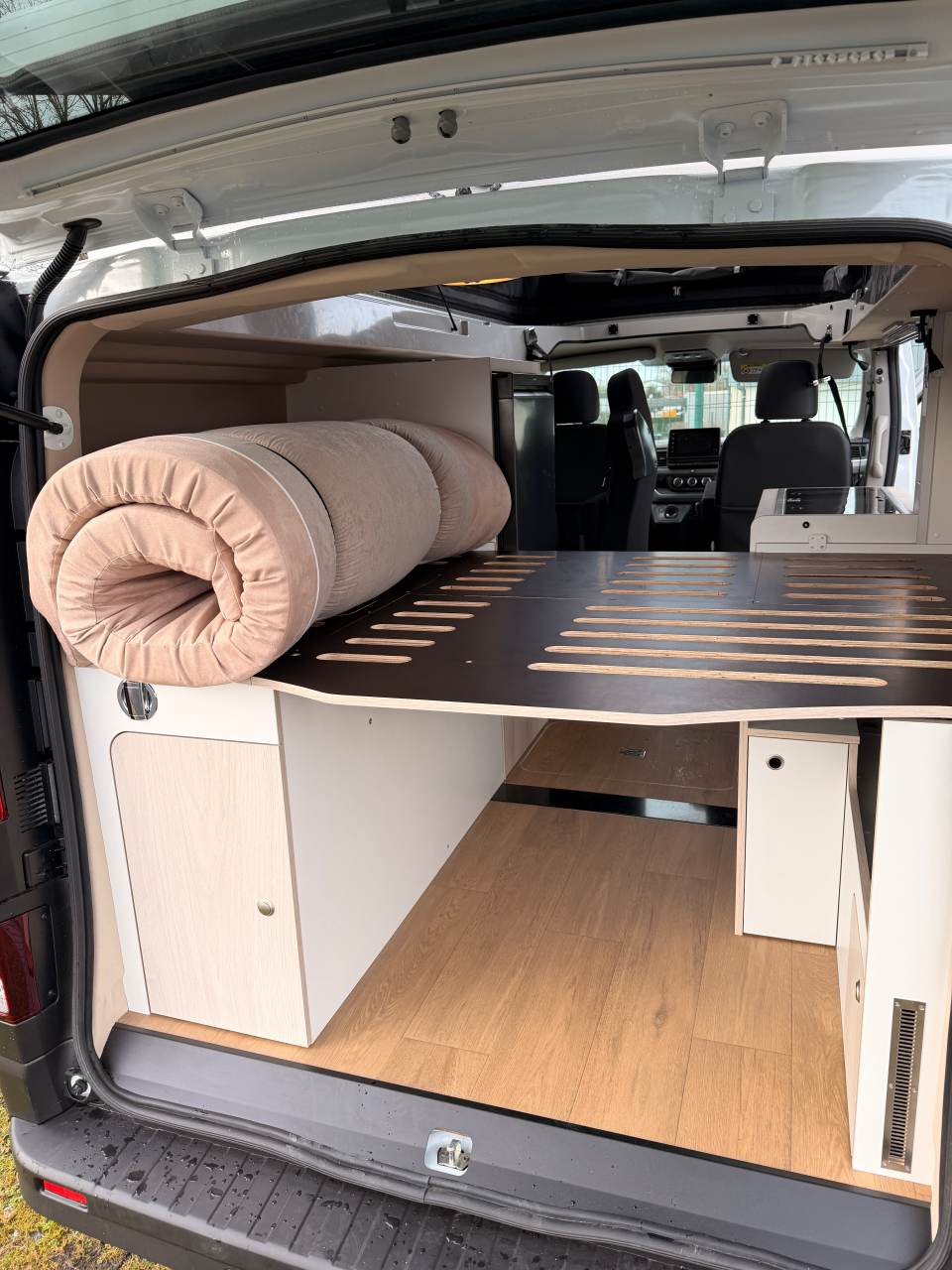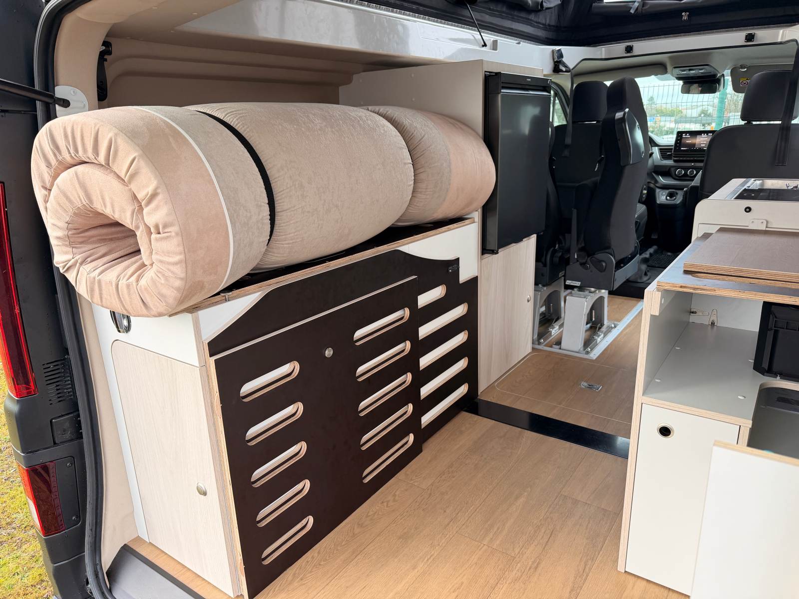 Si cette nouvelle proposition en Édition Spéciale (ES) ne devrait pas surprendre outre-mesure les fidèles de la marque, elle ouvre néanmoins d’intéressantes perspectives. Tout d’abord, l’absence des tiroirs sous le lit transversal augmente sensiblement la profondeur de chargement (123 cm), qui pourra s’étendre sur le couloir central, lors du transport des vélos ou des objets longs (planche de surf et autres). Voilà une initiative attendue par les voyageurs. Au gré des exigences, l’arrêt de charge, composé de deux planches superposées, est totalement ou partiellement amovible. Ensuite, le sommier se replie et le matelas se comprime comme un rouleau de printemps, à l’aide de deux sangles.