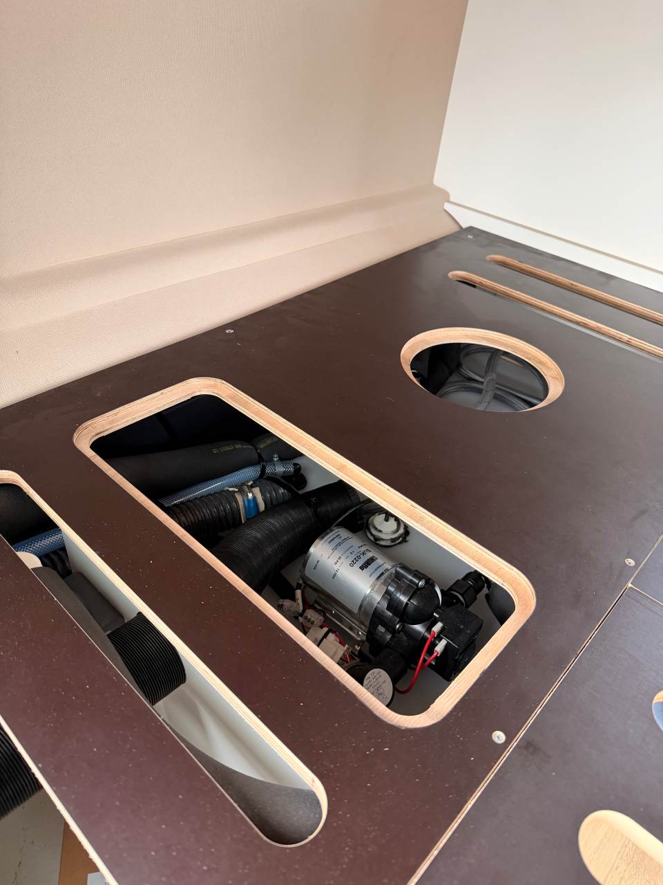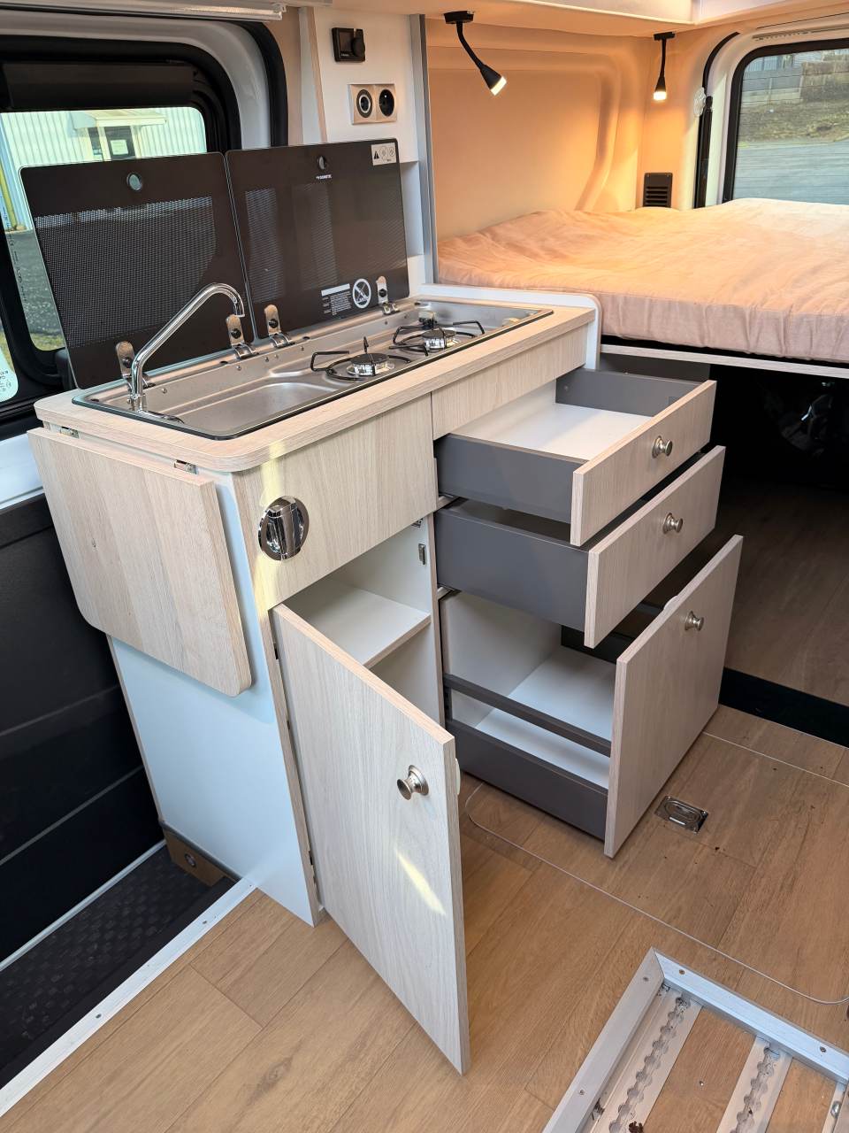 Bien que plus abordable, le modèle ES n’en reste pas moins un JCG Créations et répond au strict cahier des charges fixé par la marque : grosse réserve d’eau (150 L) et solide mobilier stratifié double face, dans trois coloris au choix : chêne blanchi, blanc et gris. Autre précision importante, les trois tiroirs de cuisine sont montés sur des coulisses Blum.
