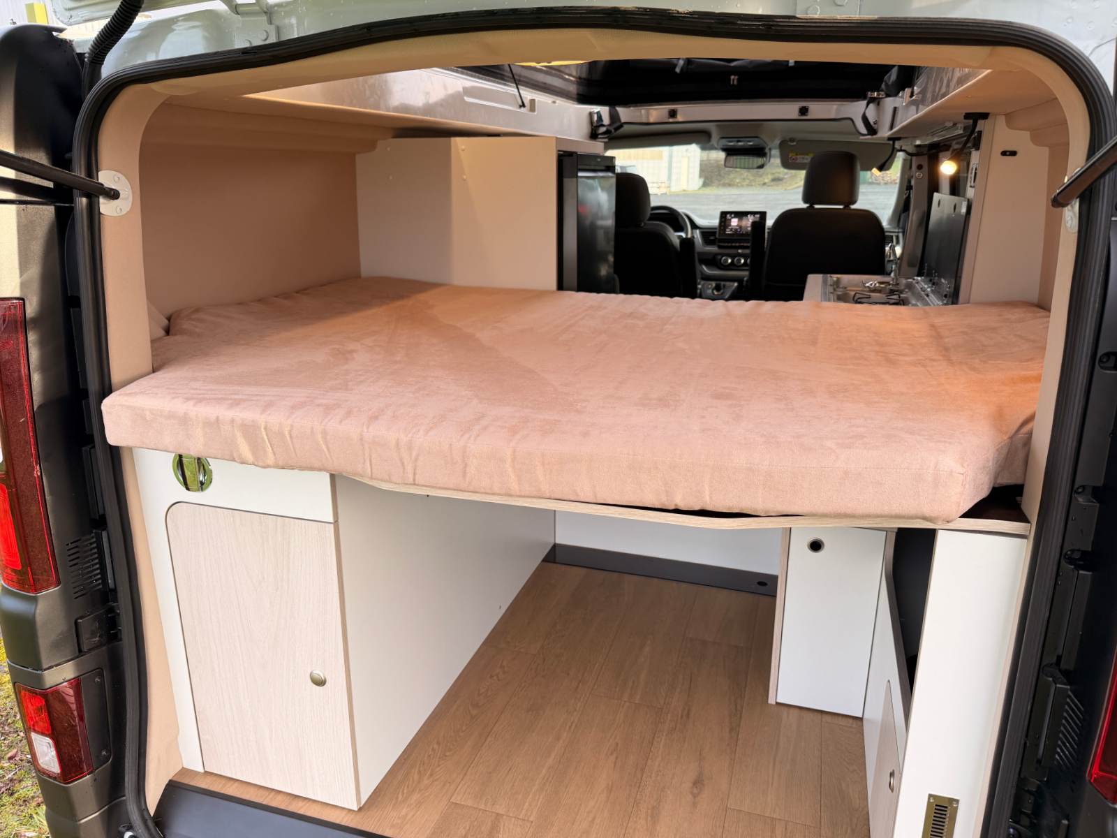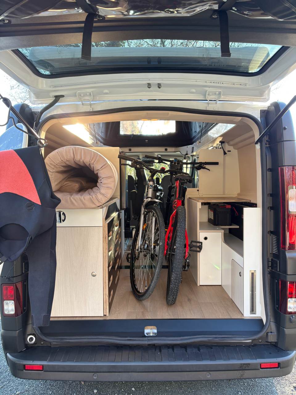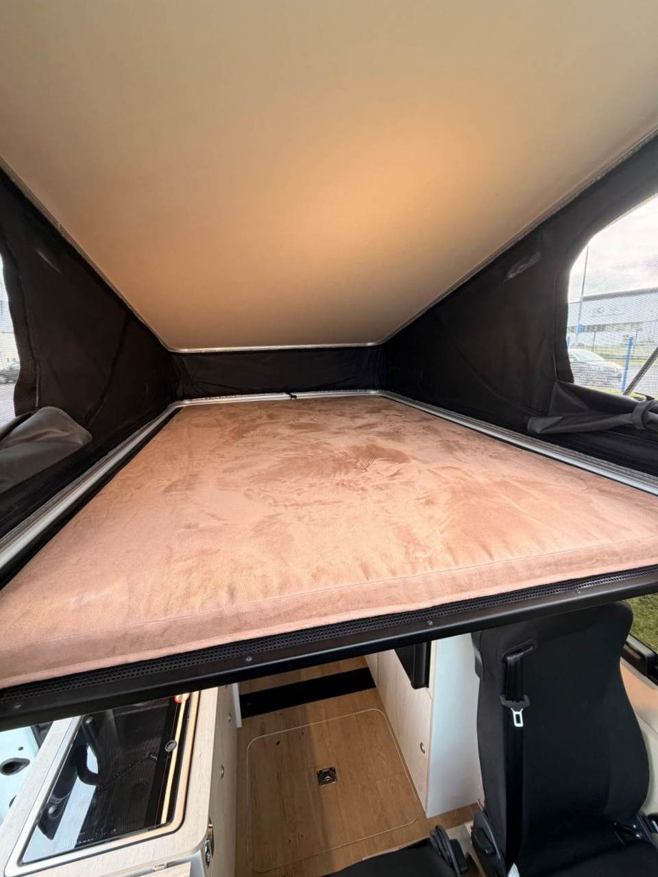L’épaisseur du matelas et les dimensions du lit transversal sont également préservées : 197 cm x 130 cm. Notez que la largeur du lit augmente au centre et se resserre aux extrémités (122 cm), vu la forme du matelas qui épouse le décaissement lié au hayon. Et si vous dormez le toit fermé, ce qui peut arriver pour diverses raisons (stationnement discret en ville), vous disposez d’un tirant d’air de 55 cm. La hauteur du lit (80 cm) pourrait justifier une marche intermédiaire, ou un point d’appui dans l’arrêt de charge. Évidemment, libre à chacun de partir avec un marchepied pliable.