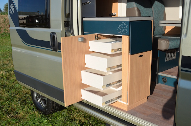Variante du BoxLife 540 MQ, ce nouveau 540 MK conserve les mêmes dimensions contenues, mais ajoute en option un couchage simple (180 cm) aux trois places nuit déjà existantes. C’est un atout supplémentaire pour ce petit fourgon atypique qui soigne le décor et le confort en dînette.