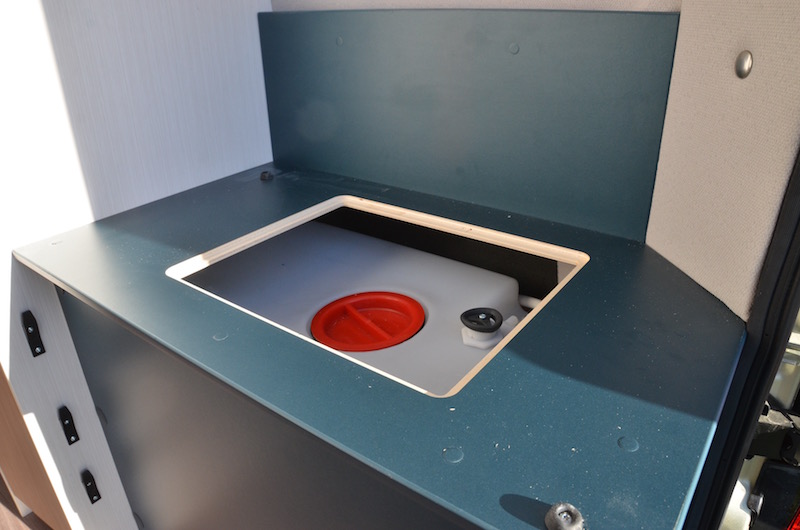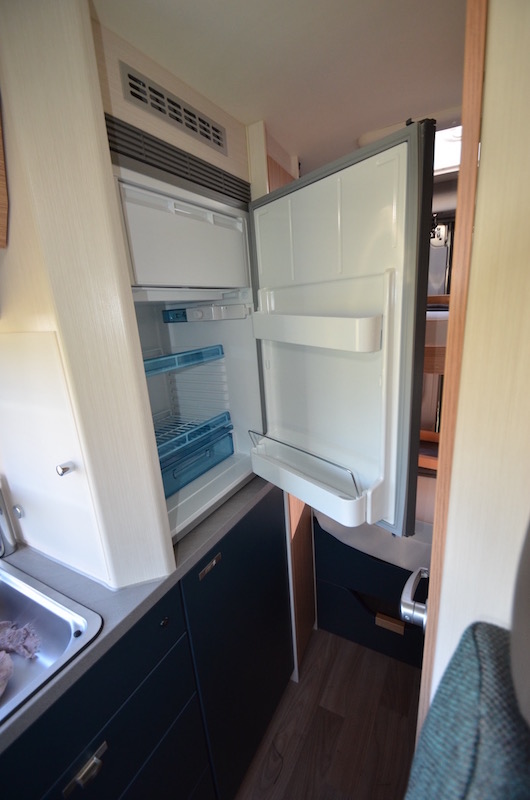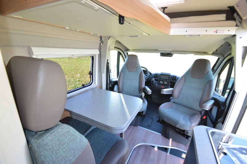 La disposition du lit, qui descend dans la longueur du véhicule, autorise la création d’un profond et très confortable salon, associé à une grande table (65 x 80 cm) et sa rallonge. Là encore, c’est un atout inédit et totalement impensable sur d’autres modèles de fourgon en 5,40 m. Sous la table, l’emprise du coffre à gaz (une seule bouteille) surprend, mais n’est pas préjudiciable confort.