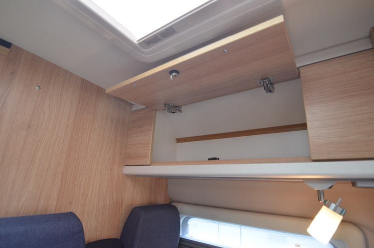 Compte tenu de la faible largeur de la salle d’eau et le pincement du matelas en pied (128cm), KNAUS préserve une belle profondeur en dînette, à la différence de certains modèles concurrents de même dimension (5,41m). C’est un point à surveiller si vous ne voulez pas heurter les genoux de votre partenaire d’en face ! Au-dessus du salon, un grand lanterneau Midi-Heki (70x50cm) monté de série, à l’instar de celui dans la chambre (40x40cm).