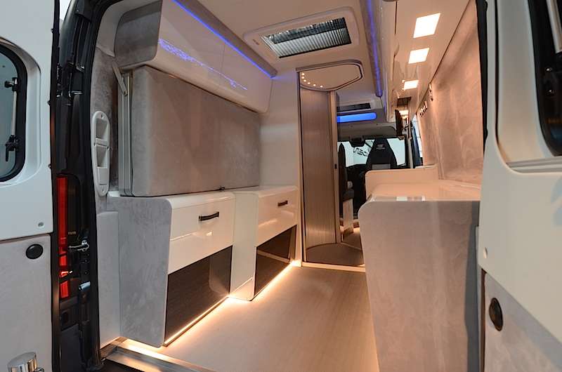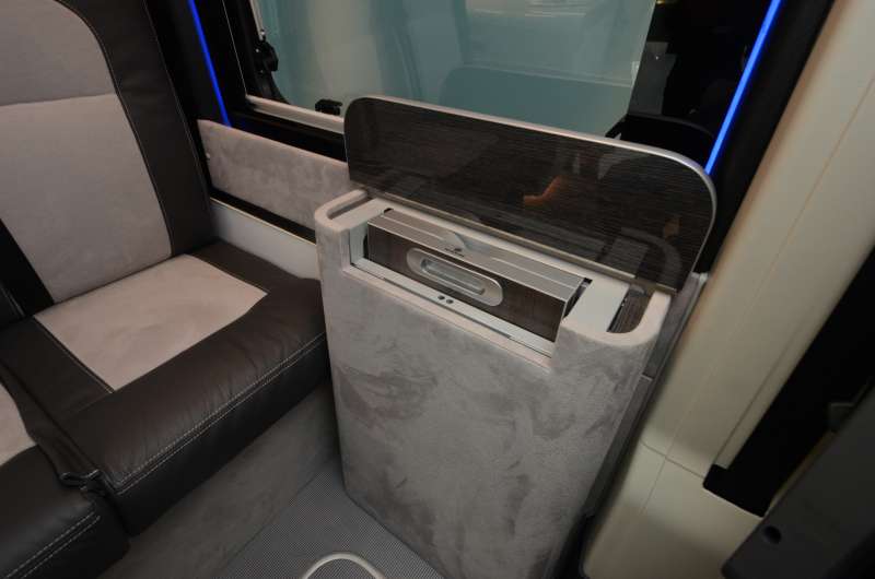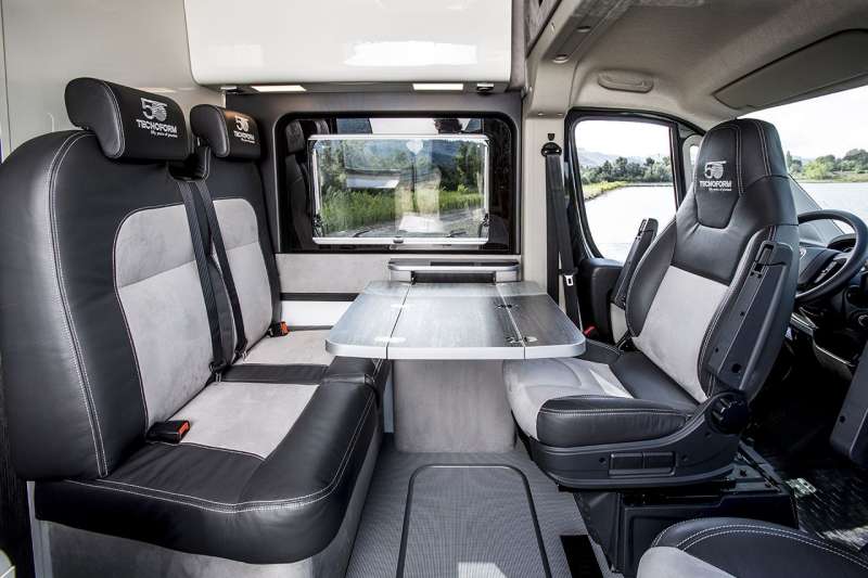 Reconnue pour ses compétences en matière d’aménagement dans le camping-car, Tecnoform signe une intérieur très haut de gamme, pas franchement adapté pour le 4 X4… L’important est ailleurs. L’élégance, le confort, la fonctionnalité et la technologie sont au rendez-vous. A noter, en particulier, le système d’illumination intégré au mobilier, le système audio de pointe, ainsi que les deux écrans plats rétractables.