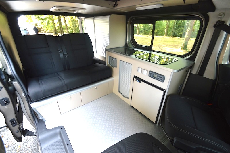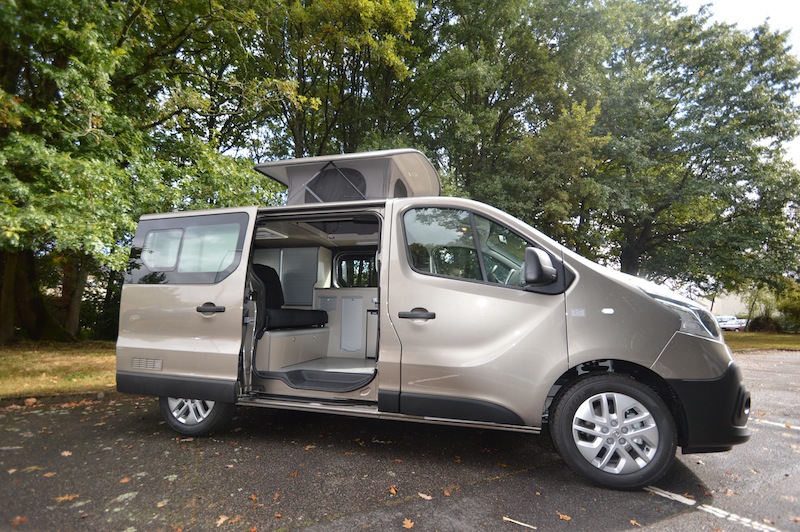 Sans surprise compte tenu de ses préférences pour les fourgons compacts, CSA Gérard l’intègre à son catalogue et lui attribue son plus célèbre agencement, le Mobispace, décliné à l’envi sur la plupart des bases roulantes. Il se compose d’un meuble latéral de cuisine et d’une banquette convertible deux ou trois places route. L’éventail des solutions couvre les besoins les plus divers. Le Renault Trafic peut recevoir un petit toit, comme le modèle présenté au salon de Nantes, ou un grand toit relevable avec un couchage double.