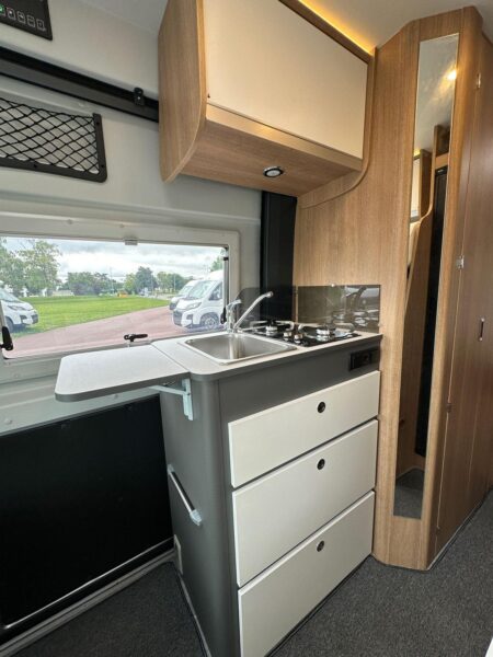 L’ambiance intérieure, quant à elle, est revue du sol au plafond en s’inspirant directement de la gamme supérieure de profilés Toscan. Des emprunts qui démontrent la volonté de hisser les Giottivan un cran au-dessus. On retrouve ainsi le même sol gris, la même teinte bois pour le mobilier et le même bandeau métal au bas des portes des placards de pavillon.