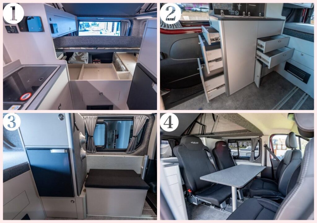 Le réfrigérateur bascule sur le côté opposé à la cuisine, à mi-hauteur, et gagne en volume, suite au déplacement du compresseur. Ce changement a-t-il convaincu la communauté des Stylevaners ? Rien n’est moins sûr, à en croire les réactions récentes. Auparavant situé dans l’entrée, il permettait un accès plus facile au retour des courses et depuis l’extérieur. La photo dévoile également l’installation d’un coffre en remplacement du siège route. (une configuration intéressante pour des voyages en couple).
