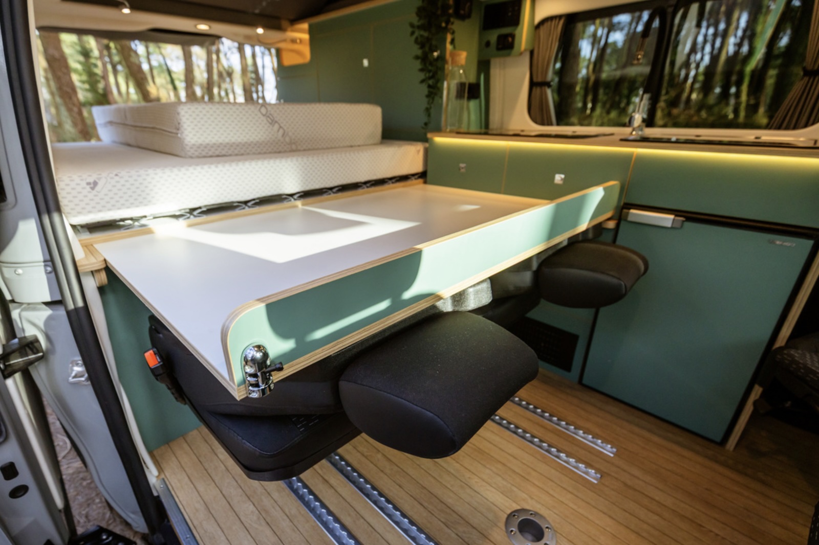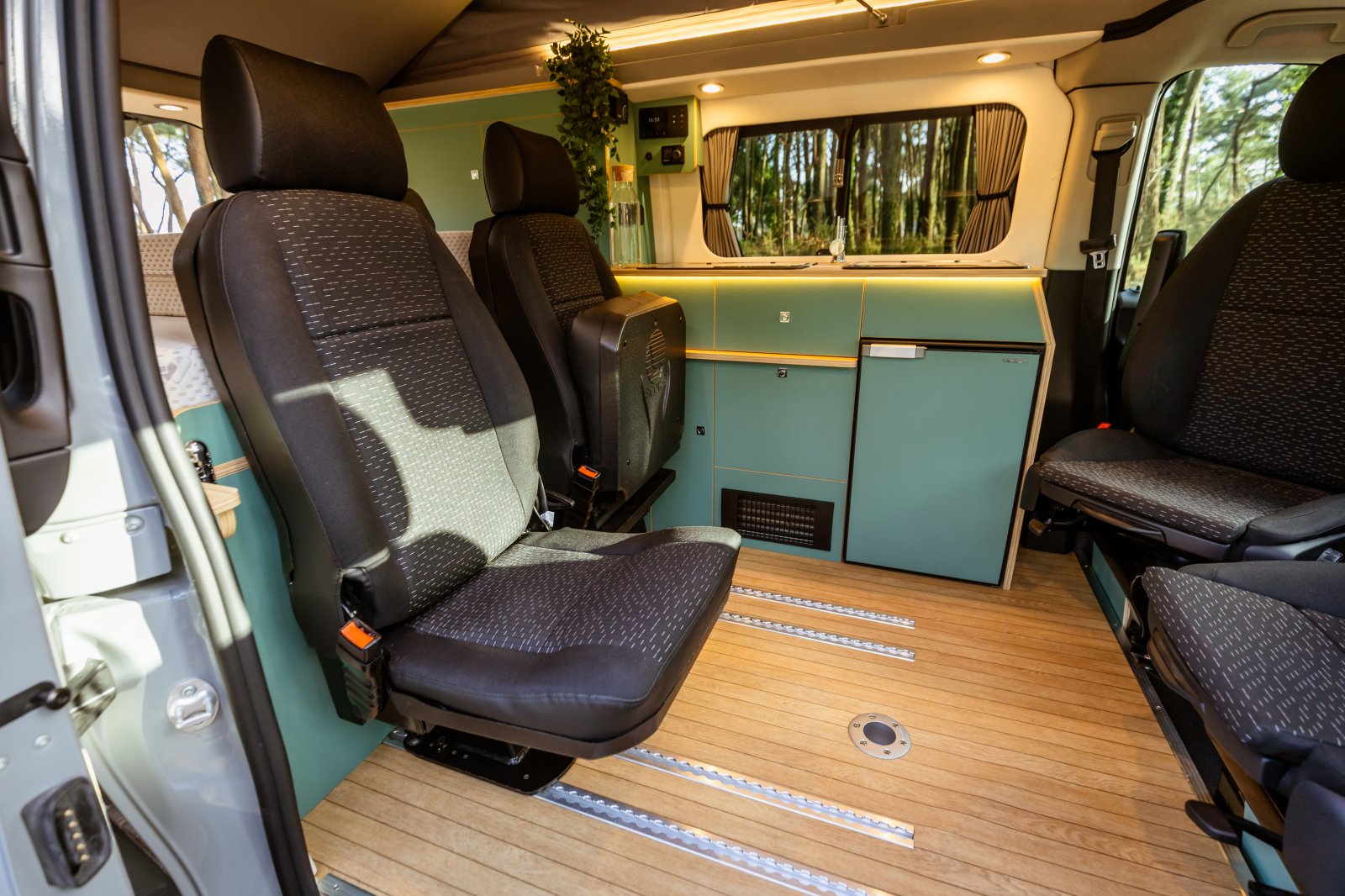 S’il peut paraître de prime abord assez classique, avec son ameublement latéral côté gauche (façon VW California), l’aménagement intérieur recèle de bonnes idées. D’abord, deux sièges individuels coulissants sur rails et démontables peuvent être installés – en option – à l’arrière pour porter à quatre le nombre de places route. Jusqu’ici, rien d’extraordinaire. Là où ces sièges – de marque Scora – se révèlent intéressants, c’est que leur assise peut être relevée pour limiter l’encombrement à bord. Leurs dossiers peuvent aussi se rabattre vers l’avant pour servir d’appui au sommier extensible. Si l’on ne retient pas les sièges, le sommier peut se déployer en prenant appui sur un tasseau intégré au bloc cuisine côté gauche et un coffre d’assise côté droit.