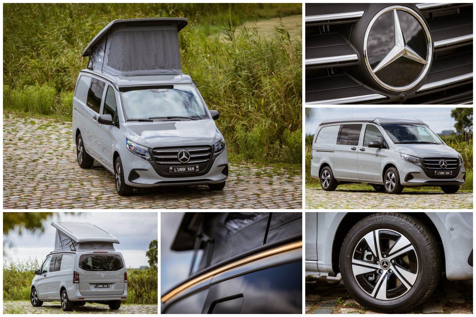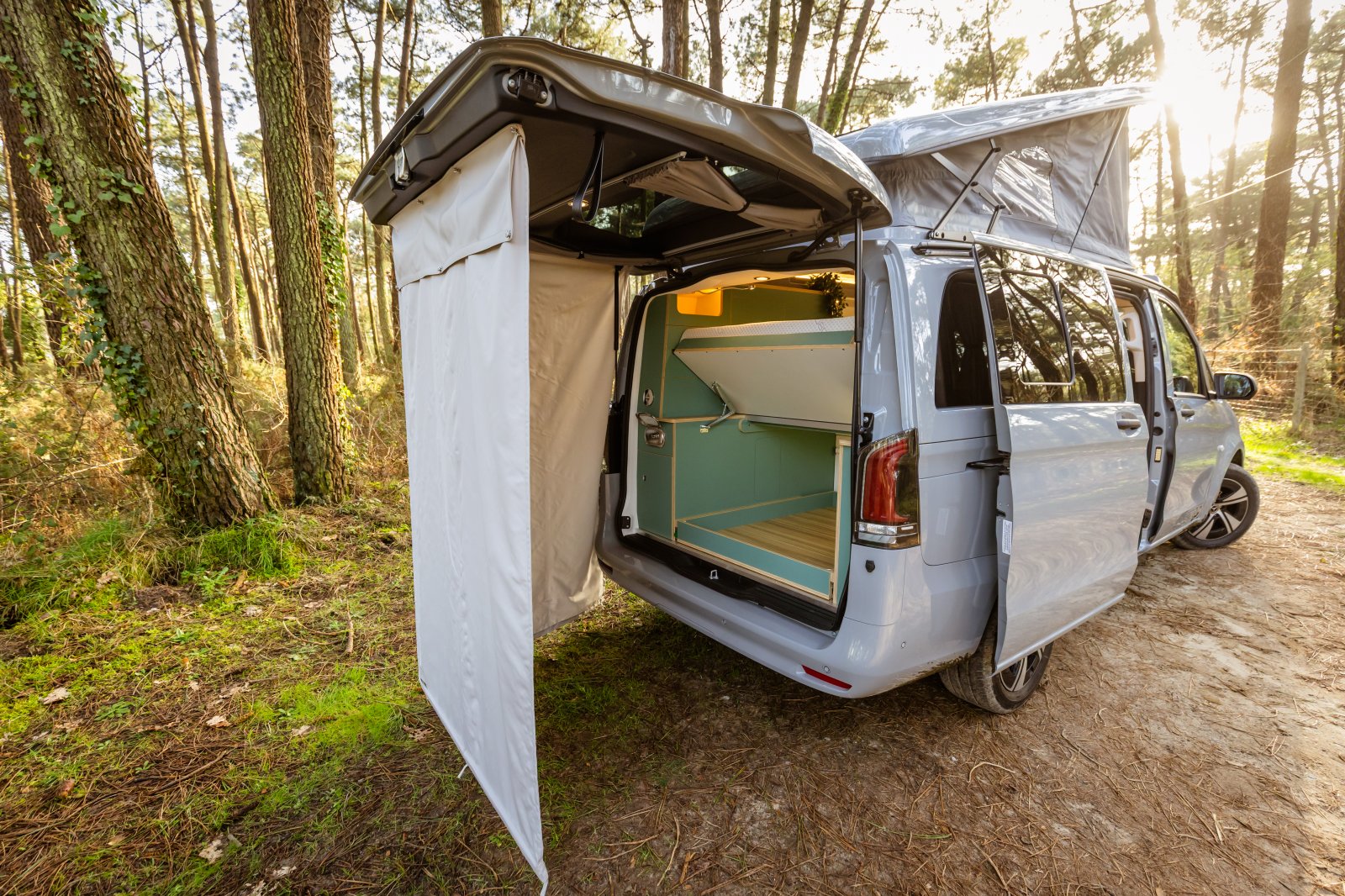 Le van Mercedes est ici livré avec une porte latérale coulissante, deux vitres ouvrantes en rang deux, un hayon arrière vitré et deux sièges cabine sur embase pivotante. En option, les plus aventuriers pourront le retenir avec la transmission intégrale 4×4, des suspensions pneumatiques et divers accessoires off-road.