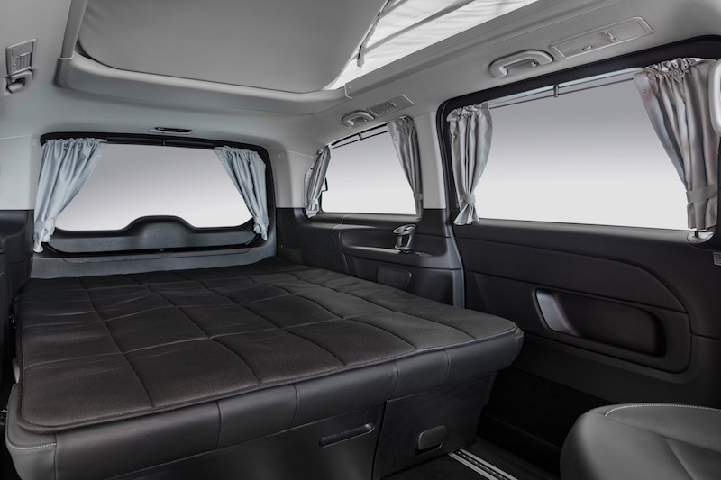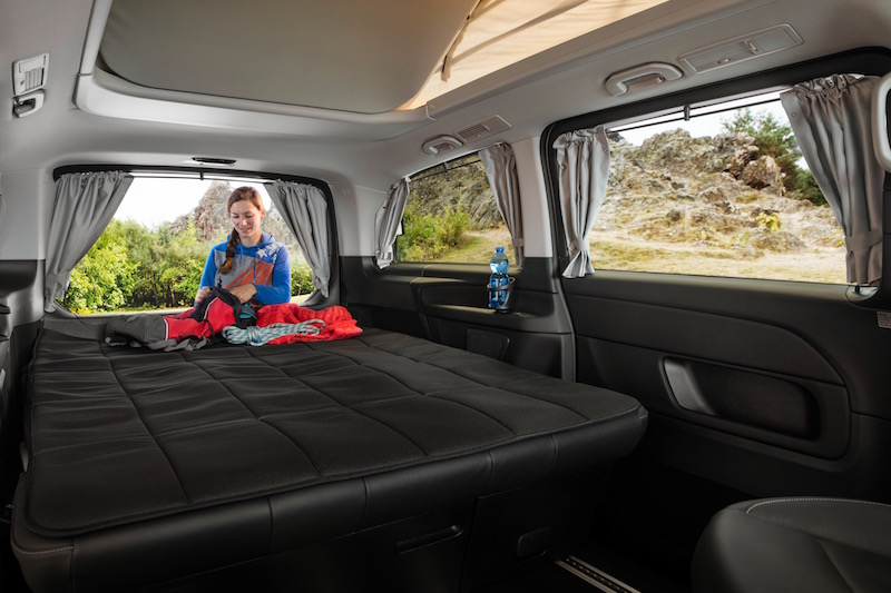 Le confort nocturne est également pleinement assuré. Le lit de pavillon sous le toit pop-up mesure 2,05 m x 1,13 m. En fonction de la configuration retenue, la banquette arrière peut être transformée en lit de 1,93 m x 1,35 m. Deux tiroirs sous le siège / couchette fournissent l’espace de rangement. En outre, il est possible d’assombrir l’intérieur en utilisant des rideaux.