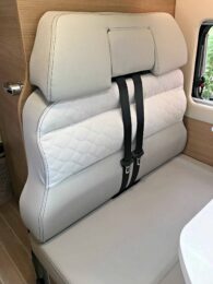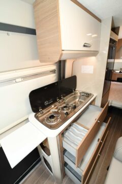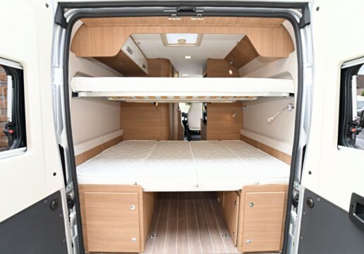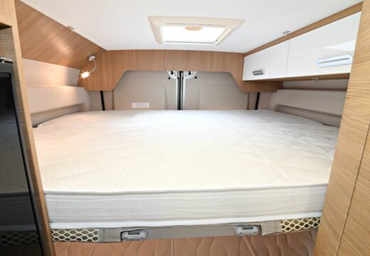 Le bloc cuisine entièrement retravaillé est une réussite : bords biseautés et découpes design des rangements latéraux, sous la tablette d’extension du plan de travail. La banquette s’habille d’une nouvelle finition d’assise, tissus Classic au tons clairs pour un effet luxueux. On retrouve là la griffe McLouis : des implantations classiques en versions suréquipées, assorties d’améliorations ciblées qui font mouche.