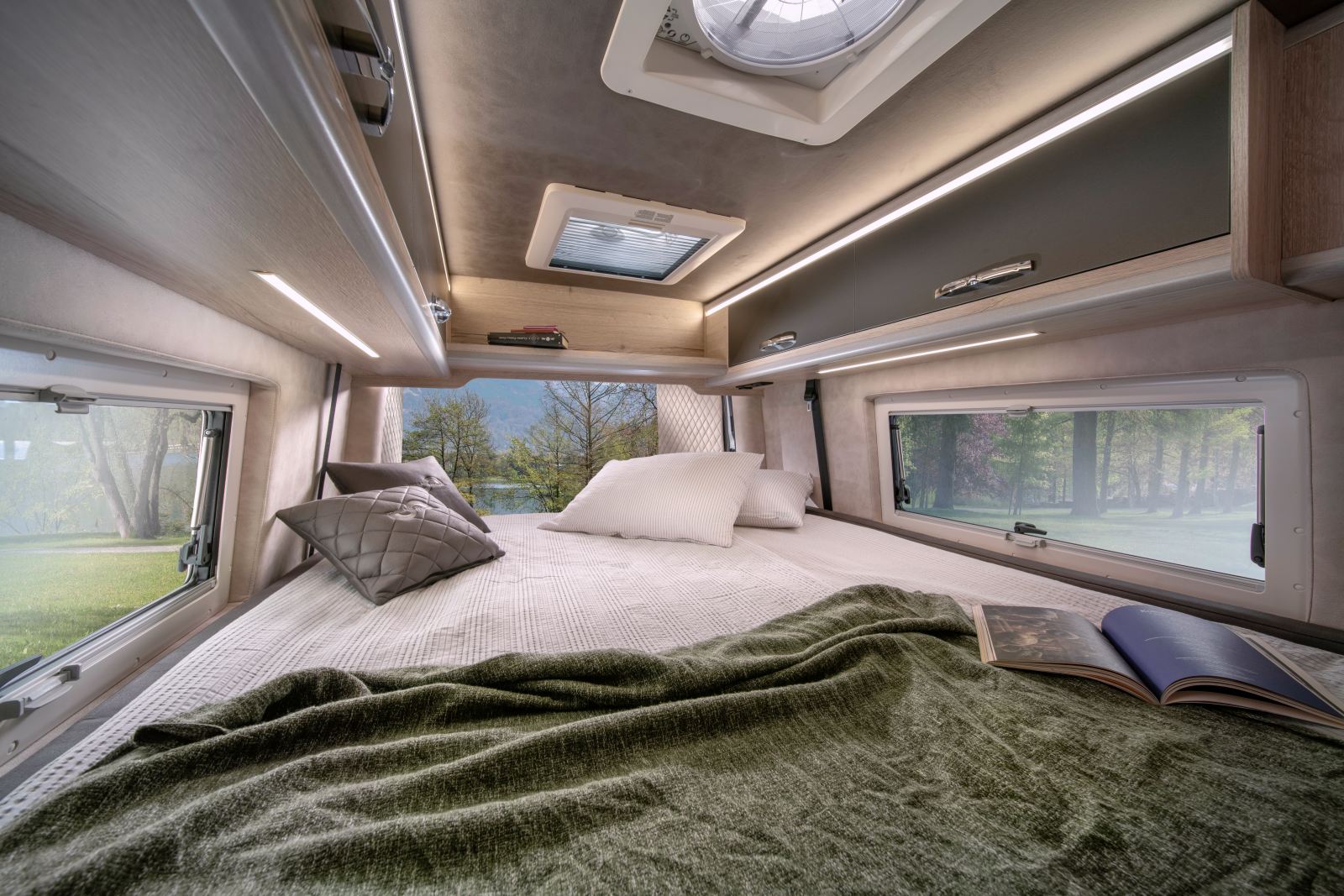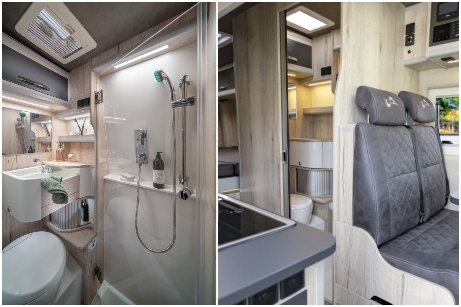 Un autre modèle maxi-soute sur Fiat Ducato H3 : le Mega Revolution, avec ses 2,90 m de haut, il héberge un lit longitudinal réglable électriquement (191 x 178/195 cm). Une fois relevé, le lit cède la place à une soute-garage de 140 cm de hauteur. La salle d’eau est équipée d’une porte en verre acrylique pour séparer la douche. Prix de départ : 79.668 € en 140 ch boite auto.