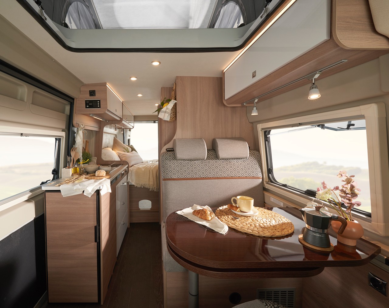 Sur la nouvelle génération de Kosmo, le réfrigérateur s’installe dans l’entrée du véhicule, dans la largeur du meuble cuisine. Une position encore inhabituelle mais qui prouve rapidement son utilité. Par ailleurs, le double sens d’ouverture de la porte du frigo facilite l’accès intérieur / extérieur. La reconfiguration de la cuisine permet aussi d’agrandir le plan de travail. Autre nouveauté à signaler, l’élargissement des fenêtres pour apporter plus de clarté, en complément d’un éclairage partiellement revu.