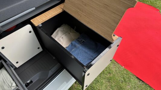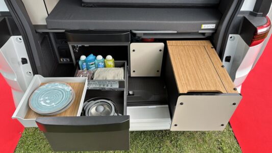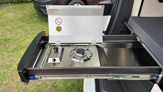Après avoir retiré le siège de gauche à l’arrière, Mykitvan ajoute un bloc cuisine latéral avec réfrigérateur, évier, rangements et table. La cuisine peut ainsi être utilisée depuis l’intérieur comme depuis l’extérieur (avec la porte latérale ouverte). Comme sur le Coast et l’Ocean, le meuble n’obstrue pas complètement la porte latérale de gauche et préserve un passage d’environ 40 cm pour les entrées et sorties. La différence réside ici dans l’ajout d’un volumineux tiroir en partie basse, rendu possible par le repositionnement du réfrigérateur. Comme sur l’ancienne génération, le frigo est encastré dans le plan de travail et offre une capacité supérieure à celle des nouveaux Coast et Ocean (49 L VS 37 L).