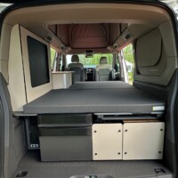 Pour la configuration de base du California Beach Camper, l’aménageur a retenu un maximum d’options : chauffage stationnaire, dispositif d’attelage, store-banne, feux LED Matrix, jantes alliage 17’’, multirails droite et gauche pour store, régulateur de vitesse adaptatif, démarrage sans clé, chargeur à induction, jeu d’ambiances lumineuses, etc.