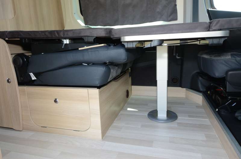 Il faut également noter la simplicité avec laquelle la banquette bascule et se transforme en couchage simple ou double (183 x 120 cm) selon les besoins. Le lit vient prendre appui non pas directement sur les sièges de cabine mais sur une mousse intercalée qui assure la la planéité du matelas. Bien sûr, en ayant recours aux sièges cabine, on perd le poste de conduite comme zone de rangement temporaire pour la nuit !