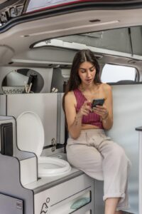 Équipements de série : WC fixe, chauffe-eau 8 l., réfrigérateur, jantes 17’’, réservoir de diesel de 70 L, radar de stationnement, caméra de recul, feux et essuie-glaces automatiques, pare-chocs avant et arrière + poignées de portes + rétroviseurs peints dans la couleur de carrosserie, station multimédia avec écran 13’’ compatible Apple CarPlay et Android Auto, 5 haut-parleurs, vitres teintées à l’arrière, volant en cuir avec commandes radio, capteur de pression des pneus, reconnaissance des panneaux de signalisation, aide au maintien de la trajectoire, régulateur/limiteur de vitesse, douchette extérieure, table intérieur/extérieur, toit relevable avec sommier à lattes, prises 12V / 230V / USB + USB-C, isolation thermique et acoustique en XPS, mobilier avec revêtement stratifié, stores plissés pour vitres arrière, rideaux isolants pour vitres cabine/cellule, deux places avec fixations Isofix, moustiquaires sur les fenêtres à battants, etc.