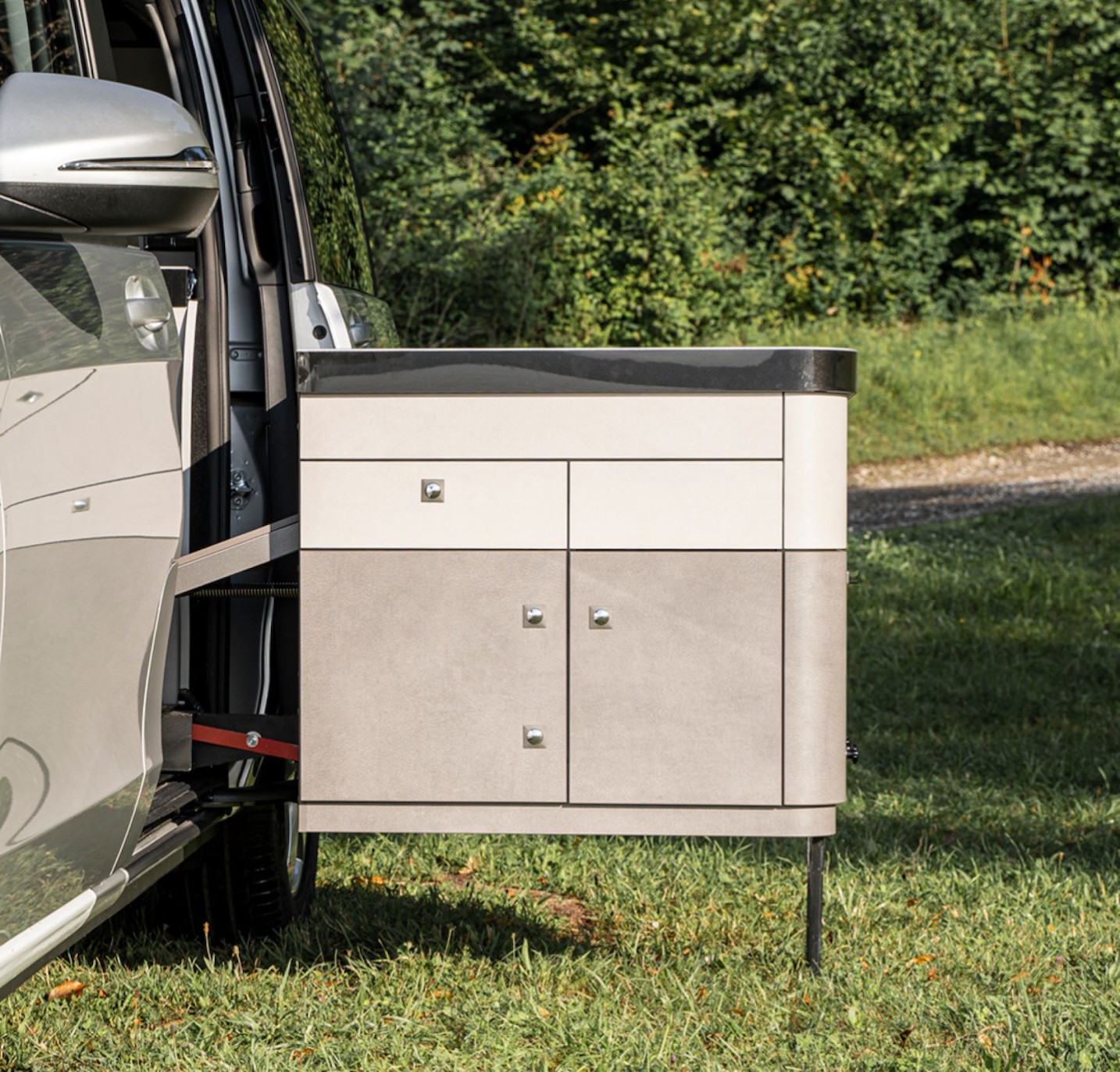 Les évolutions se concentrent également à l’intérieur. Répondant aux difficultés de sortir la cuisine amovible du Campster, compte tenu de son poids (40 kg), Pössl a imaginé et développé une platine pivotante et un astucieux bras articulé qui facilite très largement la manipulation. Baptisé « Easy Move« , ce système fait l’objet d’un brevet.