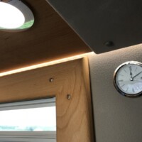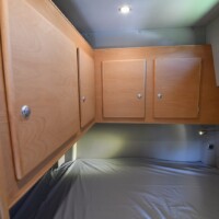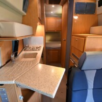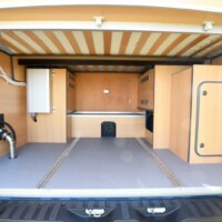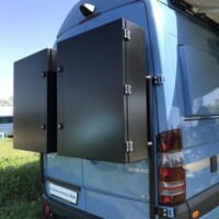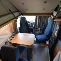 A noter aussi l’apport de l’artisan Desert Service qui a installé un réservoir de carburant supplémentaire de 120L. sous le châssis (avec une pompe transvasant le carburant d’un réservoir à l’autre) ainsi que deux volumineux coffres sur les portes arrière. En aluminium, ces derniers peuvent contenir jusqu’à 35 kg de charge et sont fixés sur les charnières de portes. Un système aussi ingénieux que solide ! Enfin, parmi les autres motifs de satisfaction, soulignons que la batterie au gel 235 Ah tout comme les réserves d’eau (150L d’eau propre ; 300L en option) sont installées dans un double-plancher partiel, protégé du gel.