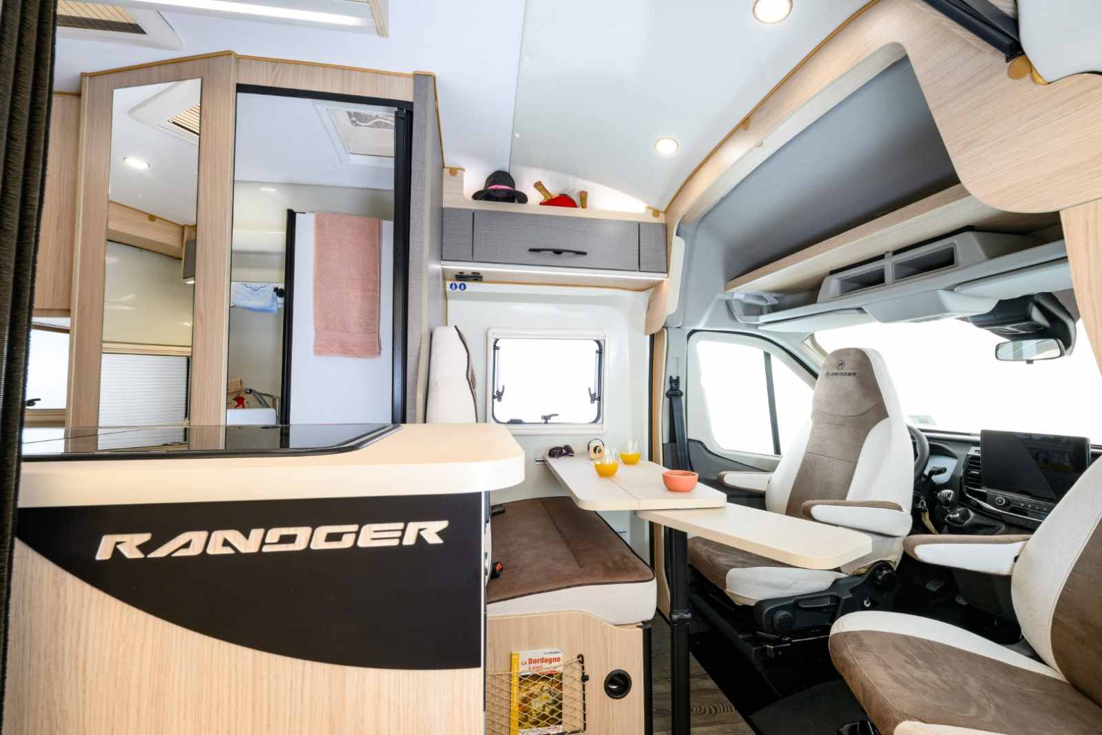 Enfin ce modèle Randger sur Ford Transit profite des nombreuses dotations du porteur. À commencer par des jantes alu 16“, ou un pare-buffle à l’avant. Les agréments de conduites comptent un autoradio Sync IV avec écran 12’’associé à 4 haut-parleurs et un modem 5G. On pourra compter sur les ADAS Ford : ESP, ABS, TCS, régulateur et limiteur de vitesse, pour des escapades en toute sérénité.