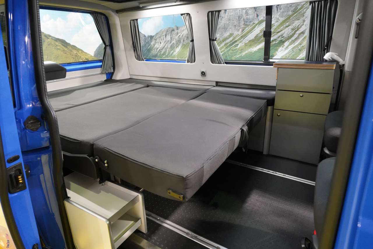 Après transformation, la banquette convertible VarioTech s’aligne à l’horizontale à la hauteur d’un coffre latéral recouvert d’une mousse. En conséquence, toute la largeur du véhicule est ainsi exploitée !