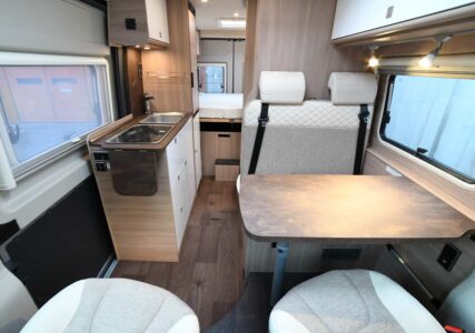 Dans la cuisine, on retrouve des équipements caractéristiques  du style Laïka, à l’image du plan de travail stratifié anti-rayures et anti-empreintes. La cuisine du Kosmo 5.4 se prolonge d’une petite extension toujours très appréciée. Bon point aussi pour le couvercle multi-usages de l’évier qui sert sur l’envers de planche à découper.