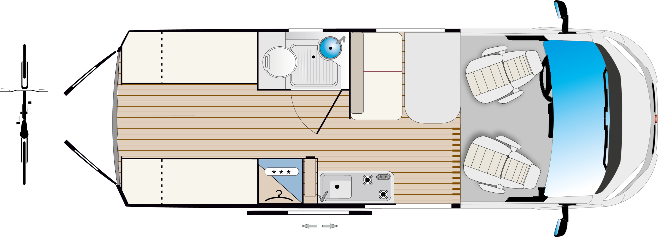 Le Silver 45 offre toute l’autonomie nécessaire pour une escapade en famille. La salle de bain intègre un lavabo avec robinet extensible, un WC chimique, des rangements et une douche. Côté cuisine, on profite d’un réchaud 2 feux, d’un évier, d’une extension du plan de travail et de 3 grands tiroirs pour les rangements.