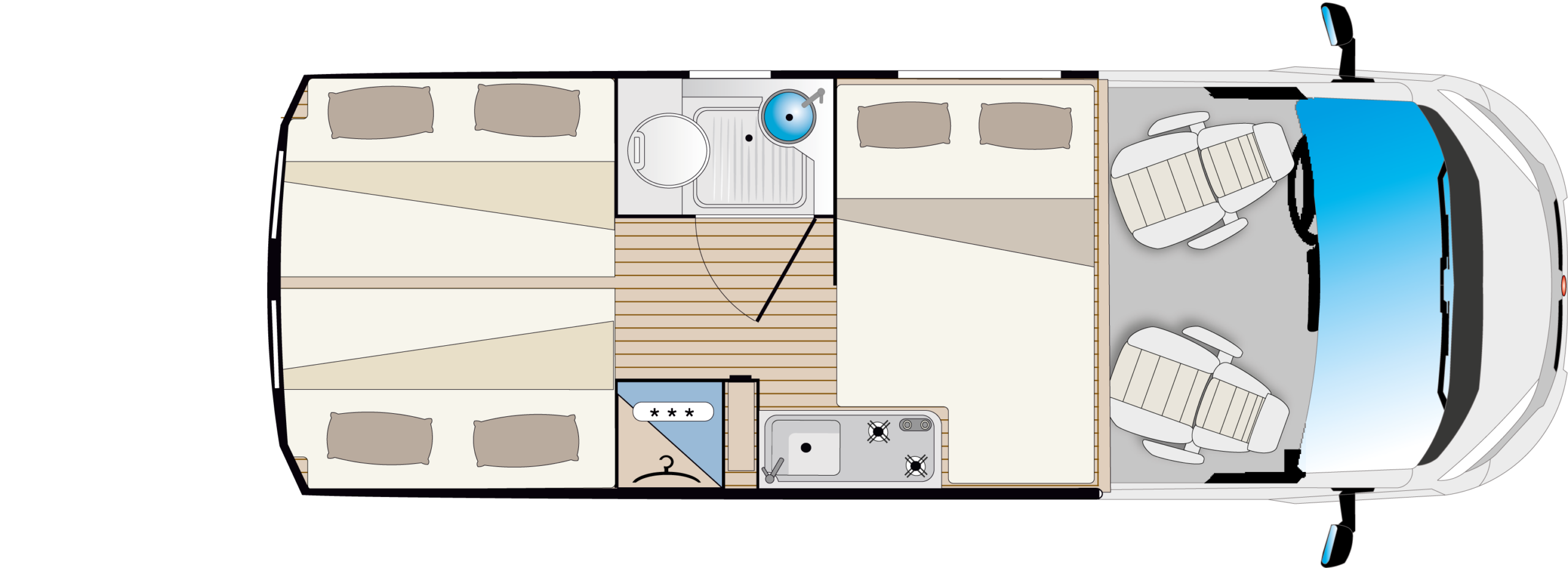 - Couchage secondaire : 2 lits d’appoint dînette, 115 x 182 cm et 115 x 140 cm