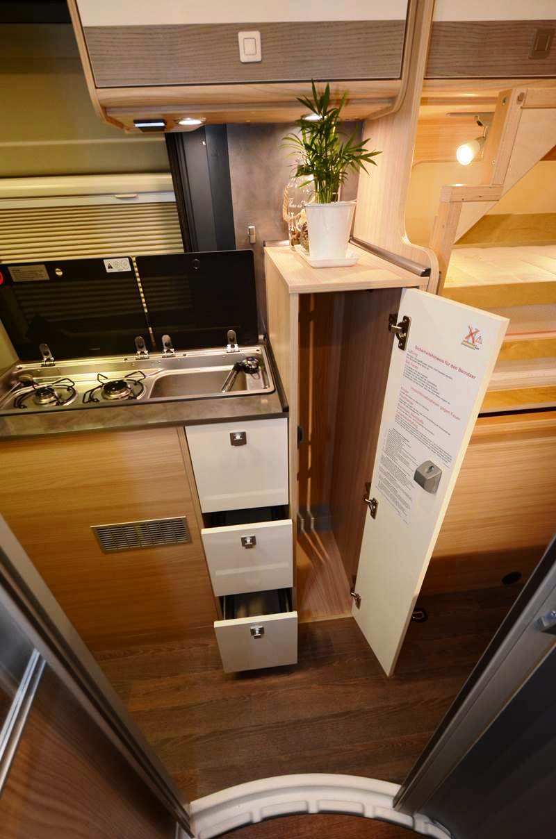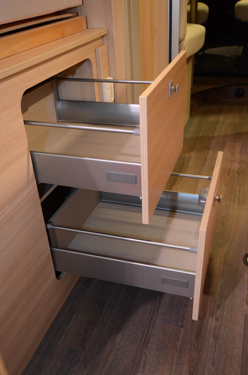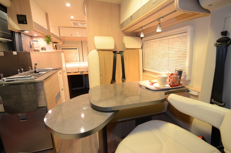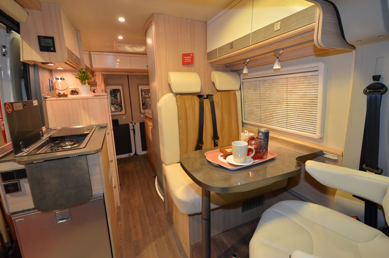 La cuisine conserve des rangements, avec 3 tiroirs superposés coulissants. Le dessus du meuble accueille un évier et un réchaud 2 feux, ainsi qu’une tablette escamotable. Au niveau du salon, la table centrale dispose d’une extension pivotante. Avec une profondeur de dînette (106 cm), les les convives disposent d’un espace mesuré mais suffisant pour leurs jambes. La hauteur intérieure atteint 190 cm.