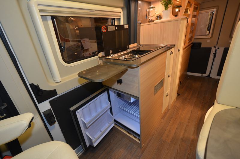 Il est le petit dernier de la gamme par ordre d’arrivée mais aussi par sa taille. Avec une longueur de 5,41 m, le City Car C 540 a été développé pour répondre à une demande croissante de fourgons compacts et maniables. L’implantation similaire au C 600, avec lit transversal arrière, a nécessité quelques modifications pour afficher 58 cm de moins. Le lit est passé de 143 à 123 cm de large, la cellule a été amputée d’une armoire, et le réfrigérateur de 80l auparavant contre le bloc cuisine, est venu se loger sous la gazinière avec un volume plus modeste (65l) et une ouverture latérale.