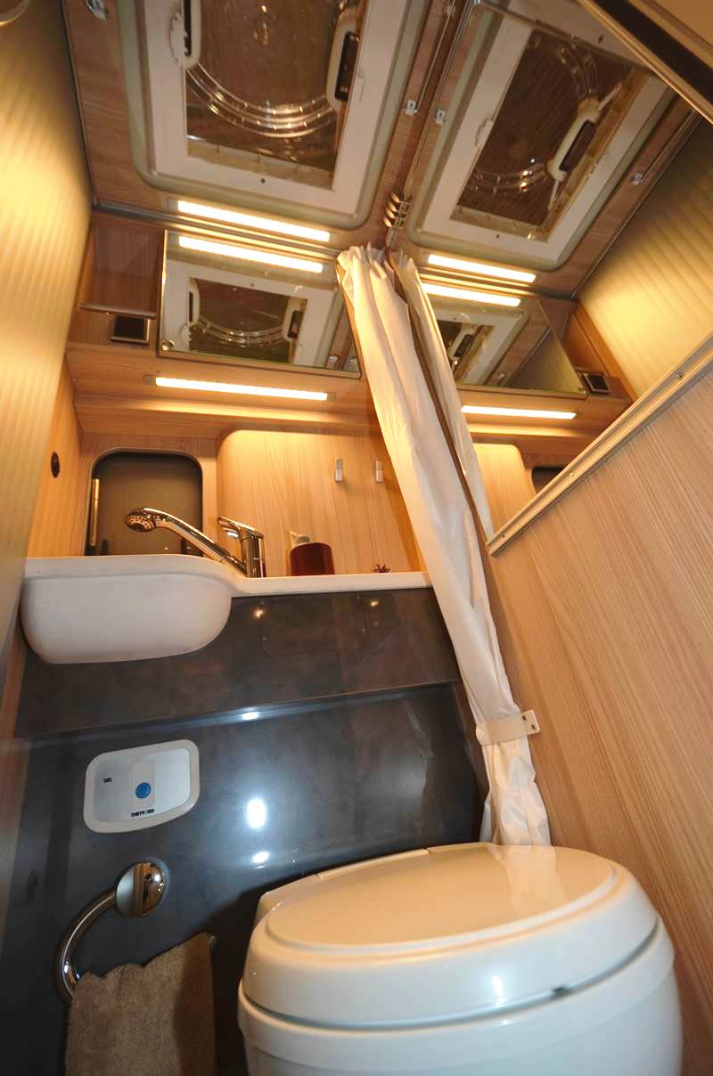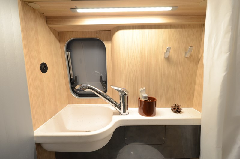 Enfin, la salle d’eau est accessible par une porte coulissante à lamelles, qui n’encombre pas l’espace. Compacte, elle comprend un WC à cassette Thetford C200, douche, fenêtre et tablette avec vasque intégrée.