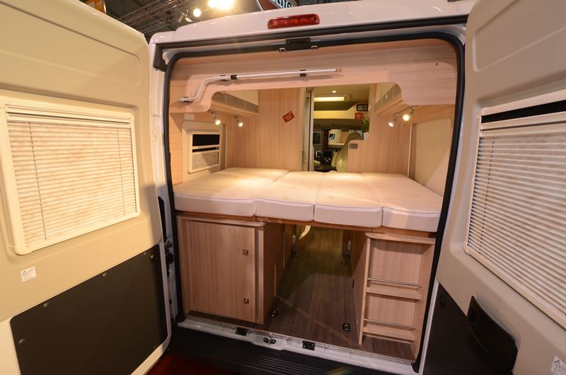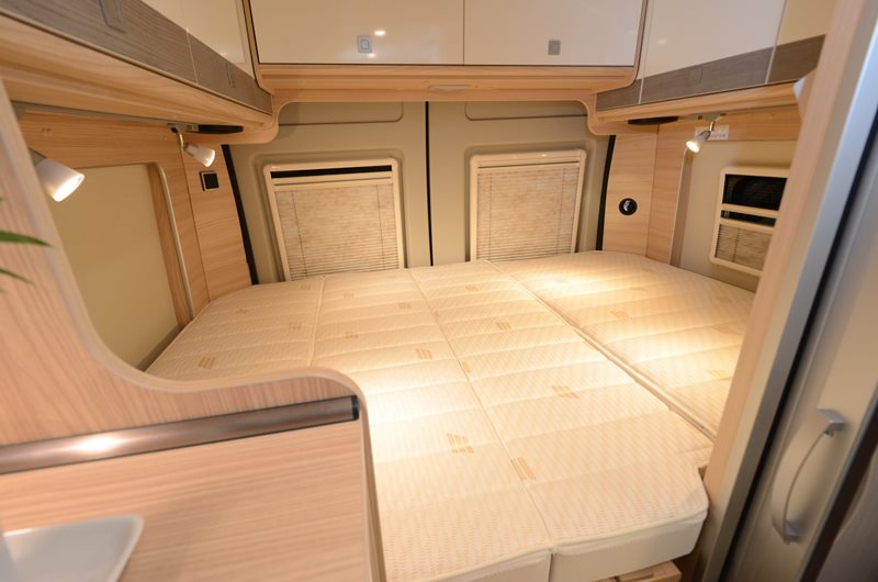 Le lit deux places à l’arrière présente une largeur constante de 123 cm et une longueur de 194 cm grâce à une découpe en creux des parois. Un sommier articulé à lattes se replie avec le matelas et libère le passage vers l’arrière du véhicule, dévoilant deux larges tiroirs coulissants jouxtant le coffre à gaz (2 x 13 kg) et, sur le meuble opposé, le réservoir d’eau. La chambre accueille également de placards de pavillon et une grande penderie (H110 x P45 x L23 cm) qui la sépare de la cuisine. Un lit optionnel en dînette (180 x 80 cm) permet de passer de deux à trois places nuit.