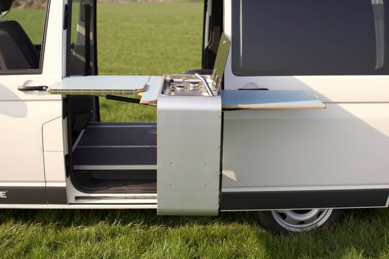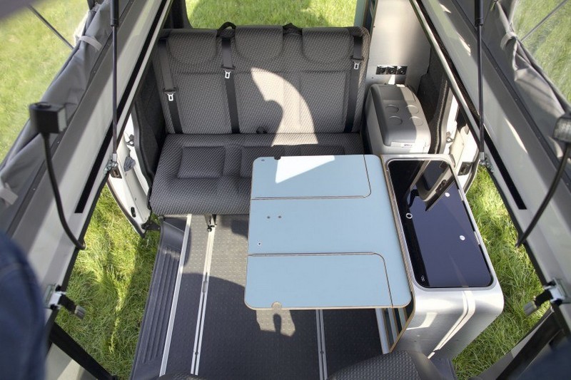 Pour parvenir à ses fins, l’artisan néerlandais a opté pour une version du fourgon Volkswagen T6 avec deux portes coulissantes. Ainsi, le meuble cuisine – avec évier et double plaque de cuisson – n’est pas fixé à la paroi mais se place le long d’une des deux portes coulissantes. Soutenu et raccordé au caisson qui jouxte la banquette par un tuyau rigide, ce meuble peut pivoter à 90° vers l’extérieur quand la porte est ouverte. Une opération qui nécessite de soulever légèrement le meuble et de le tourner côté sortie. Aussi, l’aménagement ne s’encombre pas d’une table de dînette séparée et fait appel à un plateau rabattable contre le meuble cuisine (en façade). Déployé, il est soutenu par un pied de table télescopique à vérin fixé au meuble, donc sans emprise au sol. Un bon point, même si l’on perd inévitablement en stabilité. En trois parties, dont deux volets rabattables (façon TGV), ce plateau s’adapte à vos besoins en espace. Un second plateau de table, non-modulable celui-là, est prévu sur l’autre versant du meuble. Il sera utilisable uniquement à l’extérieur.
