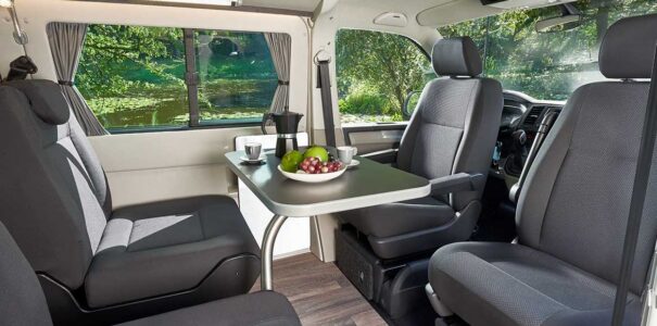 Exit la banquette passager, ces vans sont faits pour les voyages en duo exclusivement. Les sièges cabine pivotant constituent les seules vraies assises, que l’on complète avec une table amovible à l’heure de déjeuner. On trouve une assise d’appoint dans l’embrasure de la porte coulissante.