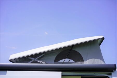 Autre intérêt de ce toit, par rapport à celui de Reimo : il est possible de lui greffer une grande ouverture panoramique dite « Panoramic view », via le pack visibilité (facturé 1990€, incluant une baie latérale à l’arrière supplémentaire). Conçu en polyester, avec un spoiler en ABS, ce toit relevable est naturellement occupé par un couchage de mezzanine.
