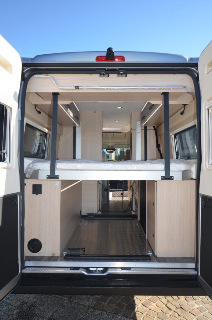 Nouveauté 2026, au même titre que le Duo Van de Font Vendôme (6,36 m), le R635 est un grand fourgon avec lit de pavillon sur soute-garage, draguant ouvertement les sportifs souhaitant pouvoir faire dormir au chaud leur(s) vélo(s) ou matériel. Sans attendre la collection 2027, Randger corrige l’un de ses défauts et abaisse dans la soute la hauteur des coffres latéraux à 90 cm (- 17 cm). De la sorte, le lit de pavillon électrique peut descendre plus bas et l’accès via l’échelle se montre plus aisé.