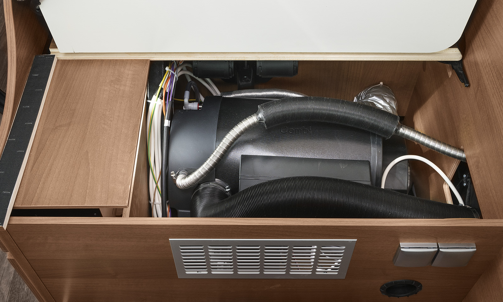 • Chauffage/chauffe-eau par l’intermédiaire du Truma D6 (diesel), de série sur les VT 540 et VT 600 L. En option sur les deux autres (+ 899€) dans la gamme VanTourer. Sur les modèles équipés du D6, le coffre à gaz est réduit à la portion congrue et n’abrite qu’une petite bouteille de 5 kg. C’est autant de place gagnée pour le rangement.