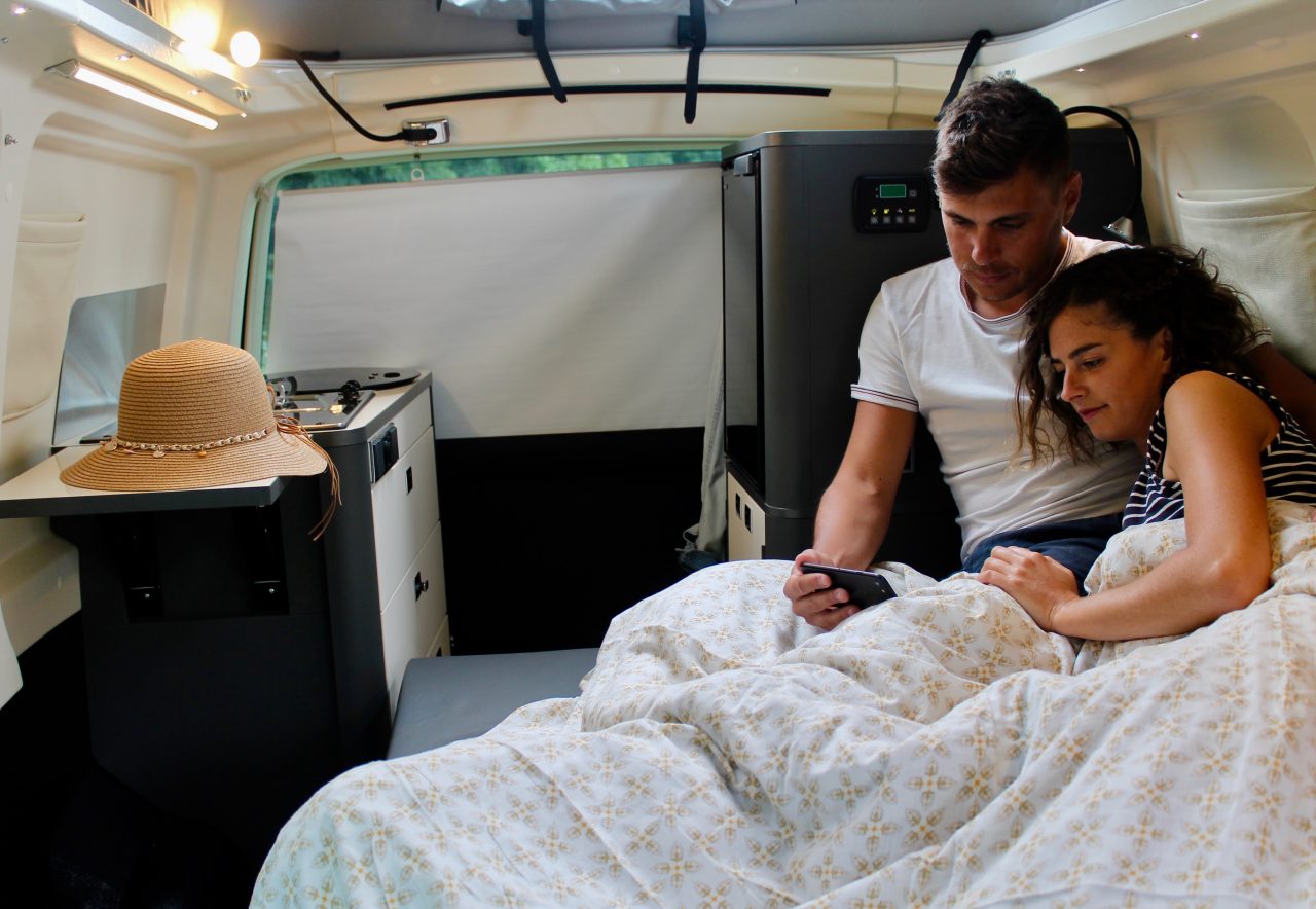 Pour la nuit, vous profitez de deux couchages, l’un mesurant 200 x 120 cm sur la partie haute, sous le toit relevable, et l’autre de 187 x 110 cm en bas. Étant entendu que la banquette ne colle pas la paroi, vous profitez d’un dégagement supplémentaire pour la nuit.