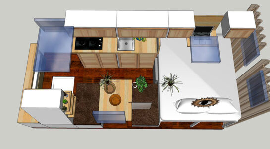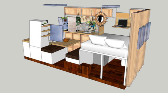 Si nous avons aménagé notre propre fourgon par deux fois, c’est pour construire du sur-mesure. Nous avions envie d’un aménagement qui nous correspondrait à 100 %. Avant de nous lancer dans les travaux, nous avons fait des plans. Nous avons pris les mesures de notre fourgon et avons essayé de replacer sur le papier les différents éléments dont nous voulions disposer. Cela nous a permis de prendre conscience de la surface disponible et de nous faire une idée du rendu. Nous avons utilisé le logiciel Skecthup qui nous a permis de nous projeter plus facilement à bord de notre véhicule grâce à une vue 3D. Cette phase de réflexion est importante dans le processus d’aménagement d’un fourgon ! C’est à ce moment-là qu’on se rend compte de ce qui est finalement faisable ou non.
