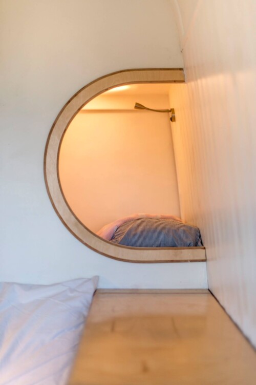 Positionnés perpendiculairement, chaque lit passe sous celui qui le surplombe dans sa moitié inférieure. On dispose ainsi d’une hauteur suffisante pour se tenir assis en tête de lit, et on glisse ses jambes dans une cavité de moindre hauteur lorsqu’on s’allonge. Les enfants, quant à eux, profitent chacun d’une véritable petite chambre qui préserve l’intimité.