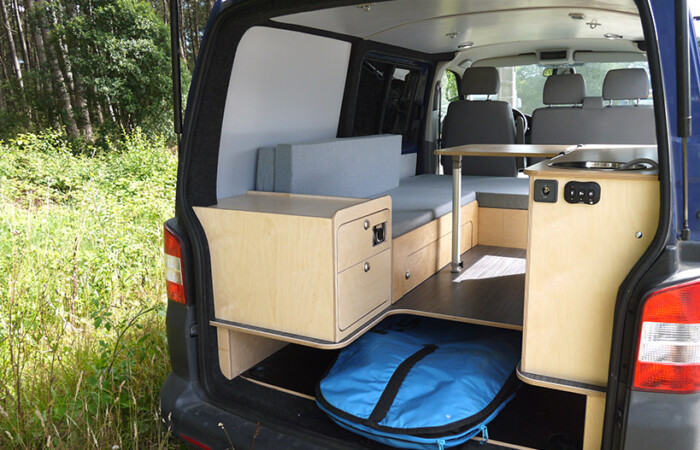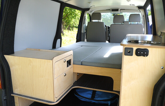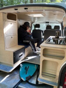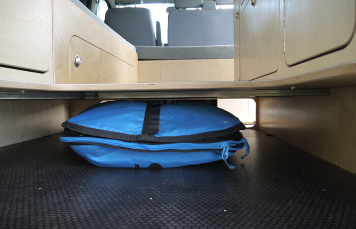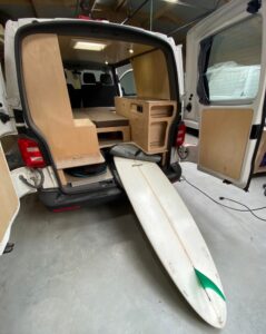 L’un des derniers aménagements en date a été réalisé pour un Volkswagen T5. Sur ce modèle, comme sur d’autres, l’ensemble du mobilier est installé sur un double plancher ou faux plancher ; sous lequel s’étire une belle soute pour ranger les surfs (L x l x h : 2,50m x 1,20m x 0,19m). « Avant de me tourner vers ce van, j’ai beaucoup cherché. Je voulais que mon matos n’empiète pas sur la zone de vie », explique Fabrice, l’heureux propriétaire du véhicule.