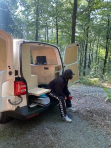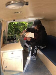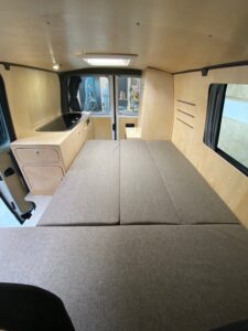 Coût de l’aménagement du van de Fabrice par LD Camp : 16 500€ incluant notamment l’homologation VASP, l’isolation, l’installation gaz et électricité avec la batterie auxiliaire, la petite cuisine avec évier et réchaud, le tiroir réfrigérant, la réserve d’eau propre et la réserve d’eaux usées sous le châssis, la douchette extérieure, la banquette en L convertible en couchage et les aérations haute et basse.