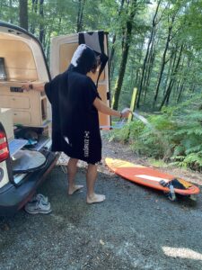 Pour ses escapades, le surfeur bordelais embarque avec lui deux planches de taille différente : 6’8’’ (207 cm) et 7’6’’ (231 cm). Mais il pourrait en emporter une troisième en optant pour des planches au format plus petits (shortboards). « Grâce à un système de crochets au plafond, j’ai la possibilité de ranger également un longboard », ajoute-t-il.