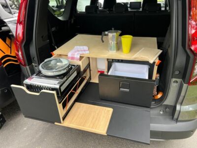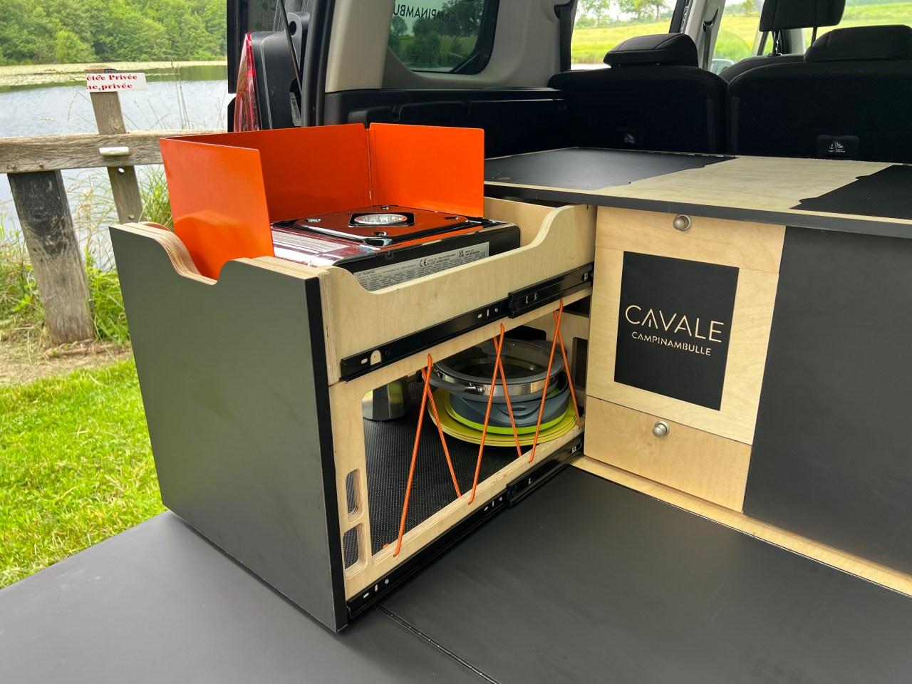 Le principe de mise en œuvre est toujours le même. Supporté par deux bras articulés, le plateau de table se déploie et ouvre l’accès aux fonctions utiles. A gauche, un espace de stockage coulissant surmonté d’un tiroir à l’anglaise accueillant un réchaud à feu unique sur cartouche gaz. A droite, un autre tiroir, remplacé en option par un réfrigérateur 12 V raccordé à une batterie portable. Le sens d’ouverture et les volumes ne sont comparables pas sur la Cavale et la Cavale Mini. De même, sur la Cavale, vous pourrez choisir une glacière inerte très efficace, en remplacement du réfrigérateur 12 V.